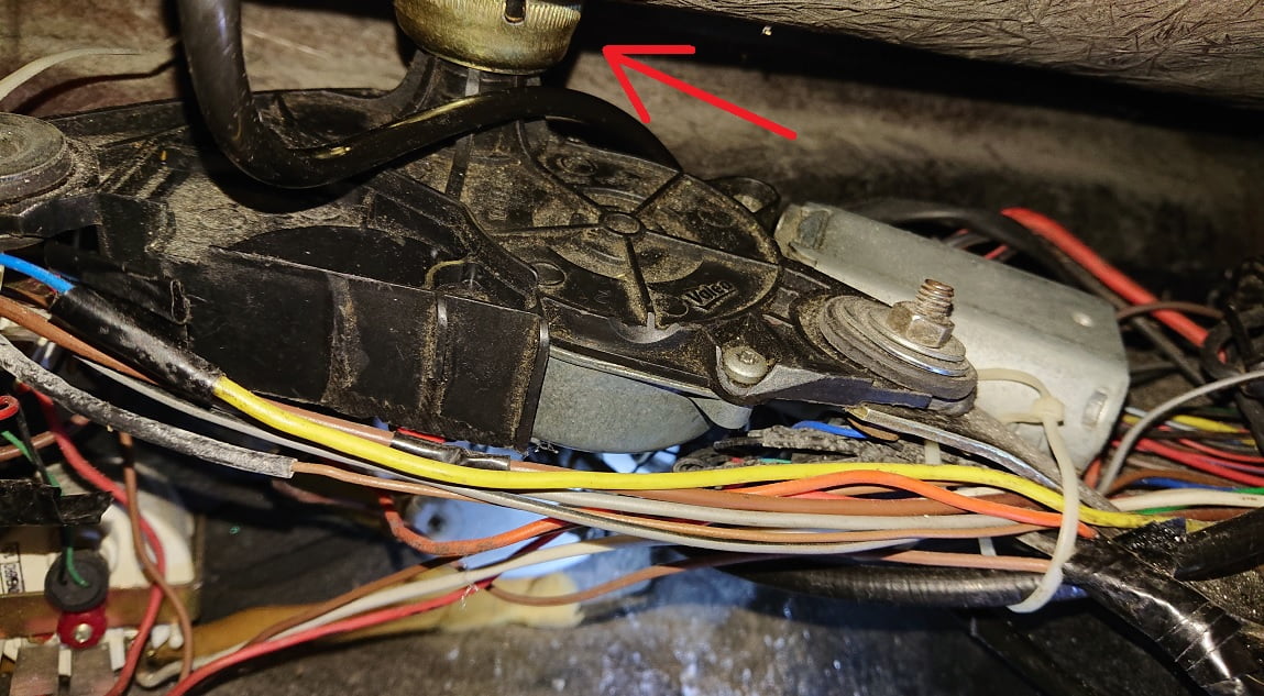 Ainda estou pesquisando, mas estou inclinado em colocar o motor do limpador dianteiro do Uno com temporizador, se ele couber ali. E outra coisa, vcs repararam o que colocaram no eixo do meu motor do limpador, como "bucha" entre o motor e a carroceria? Alguém sabe o que é? Eu sei. Vamos ver se o pessoal se dá conta. Vejam, eu indiquei com uma seta: